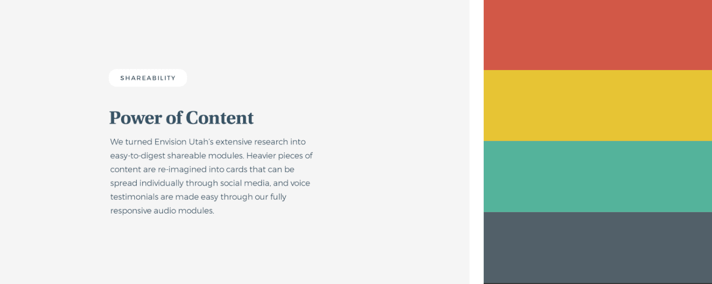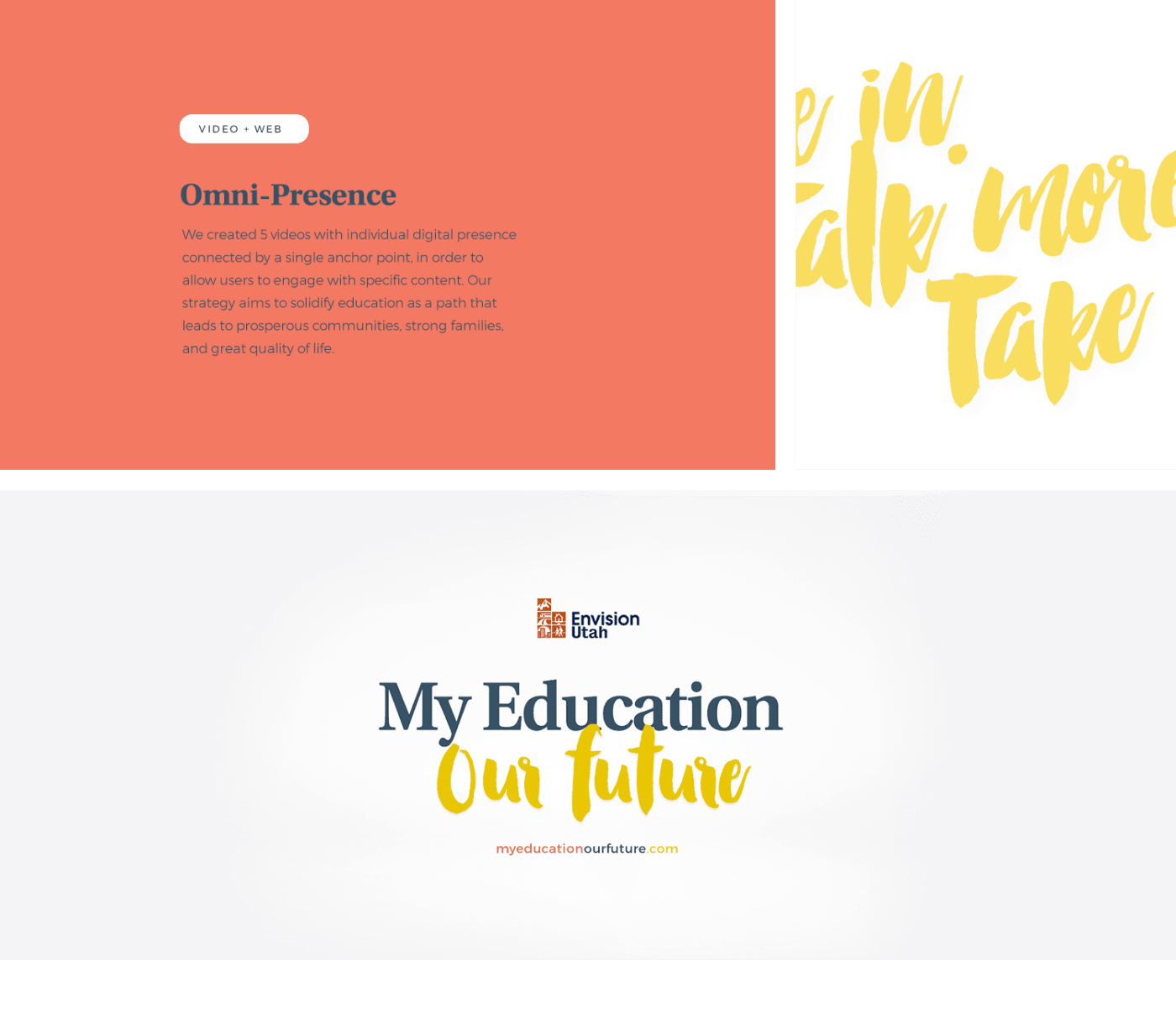 “My Education, Our Future” is a campaign run by Envision Utah that aims raise awareness to education-related issues. Our challenge was to create a consistent omni-present platform capable of delivering heavy information while remaining appealing.